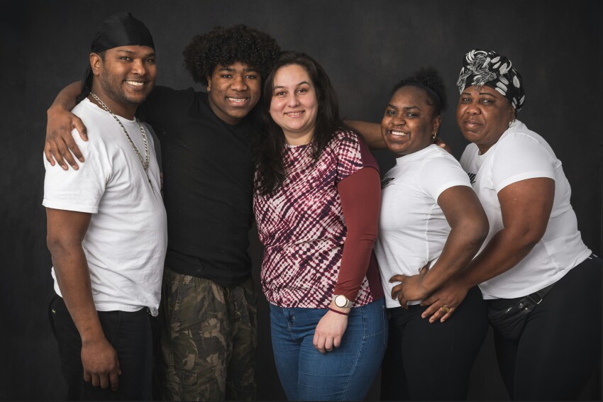 Victor Alvarez, Nicarin Alvarez, settlement case worker Natalia Vasquez, Nike Alvarez, and Olga Alvarez in Blenheim, 2022.