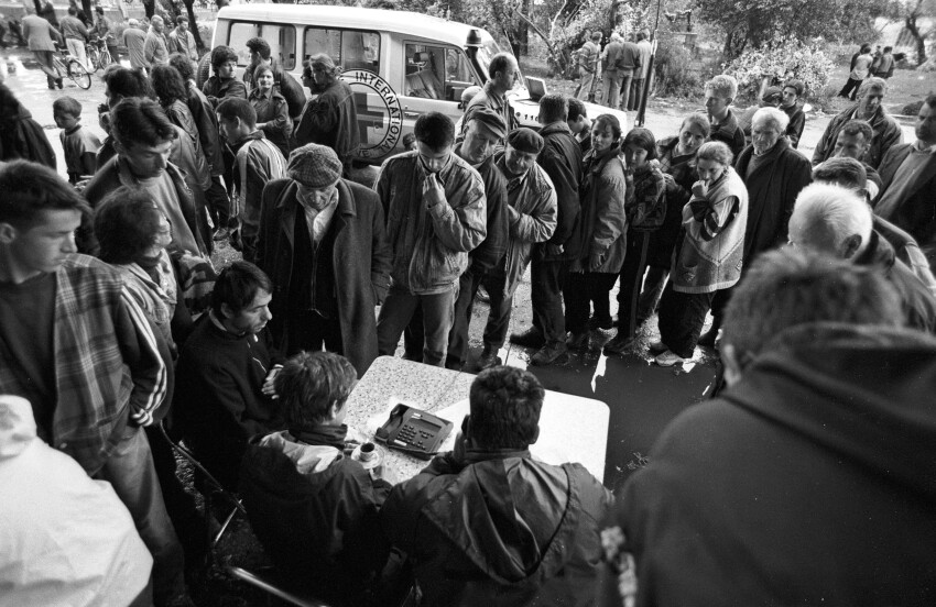 Kosovian refugees waiting to use an ICRC satellite phone in Albania, 1999.