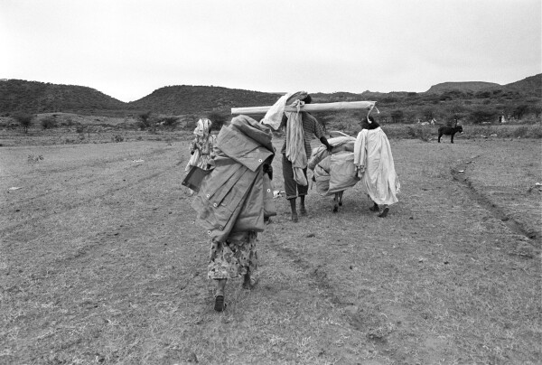 People carrying tents to set up in a displaced persons camp in Eritrea, 2000.